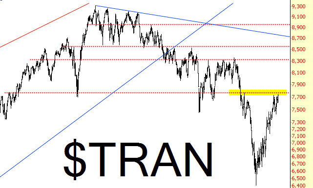 In addition, the Dow Transports (which one would think would be under pressure from rapidly-soaring fuel costs) is just underneath its enormous topping pattern.