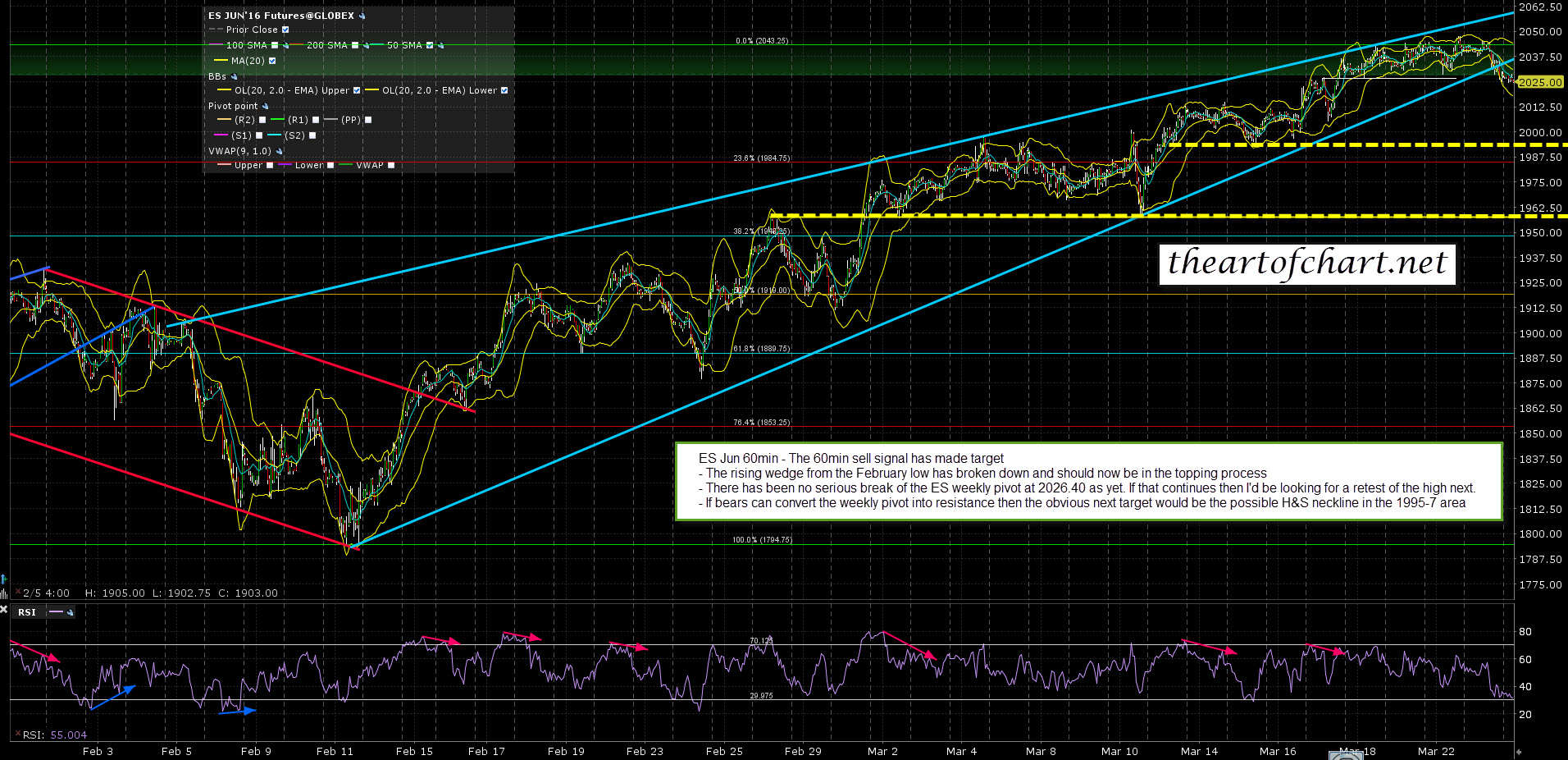 I was saying a couple of days ago that topping processes tend to start with a hard spike down and well, here we are. SPX and ES broke their rising wedges yesterday and then spent most of the day testing the strong support in the 2035 area that I mentioned in the morning. That has broken overnight and as long as that holds as resistance today, that opens up the downside towards the obvious targets at the big support levels and possible H&S necklines in the 2005 and 1970 areas. SPX 60min chart: