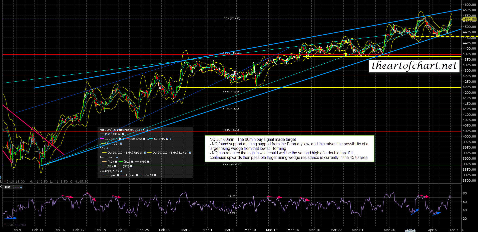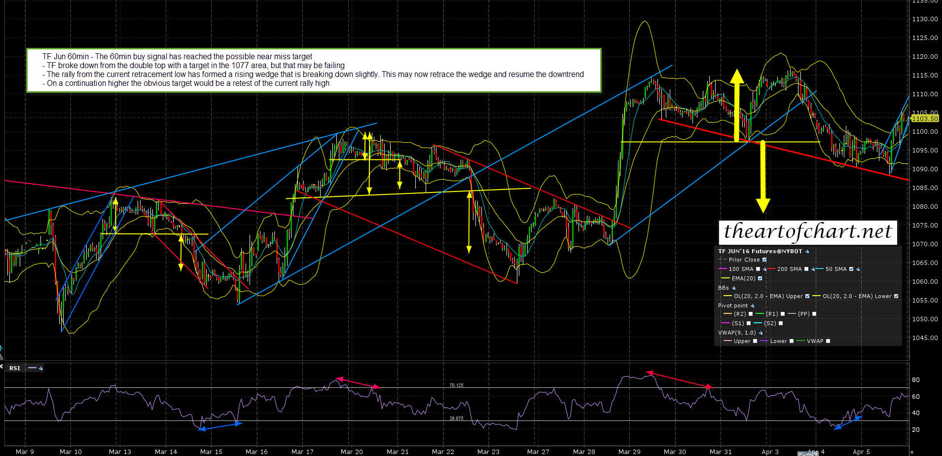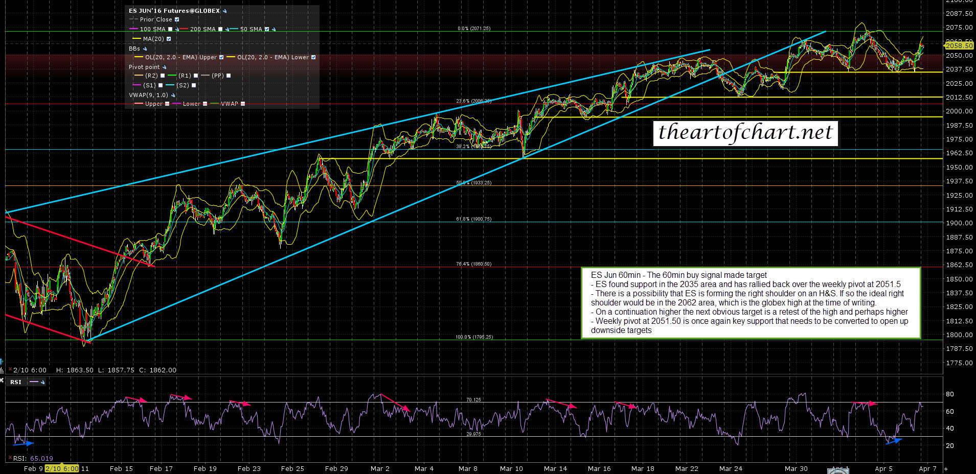 I’m using the ES, NQ and TF charts that I did last night for theartofchart.net chart service subscribers below so these do not include the globex action since. On ES the ideal right shoulder area at 2062 was reached with the globex high at exactly 2062. If ES returns to yesterday’s support in the 2035 area then the H&S will be fully formed, and if it breaks down then the target will be in the 2000 area. ES Jun 60min chart: