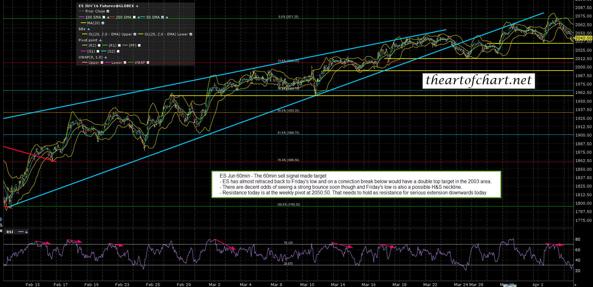 My Crazytown short trade from 2070 ES yesterday morning delivered nicely and ES broke below the weekly pivot at 2050.50 overnight. The key support levels on SPX this morning are the 50 hour MA at 2052, being tested at the open, and possible double top support at Friday’s low at 2043.98. If bears can convert the 50 hour MA at 2052 to resistance then that opens up lower targets. Today is a possible cycle trend day so it’s possible we could see a hard fail today from an AM high. SPX 60min chart: