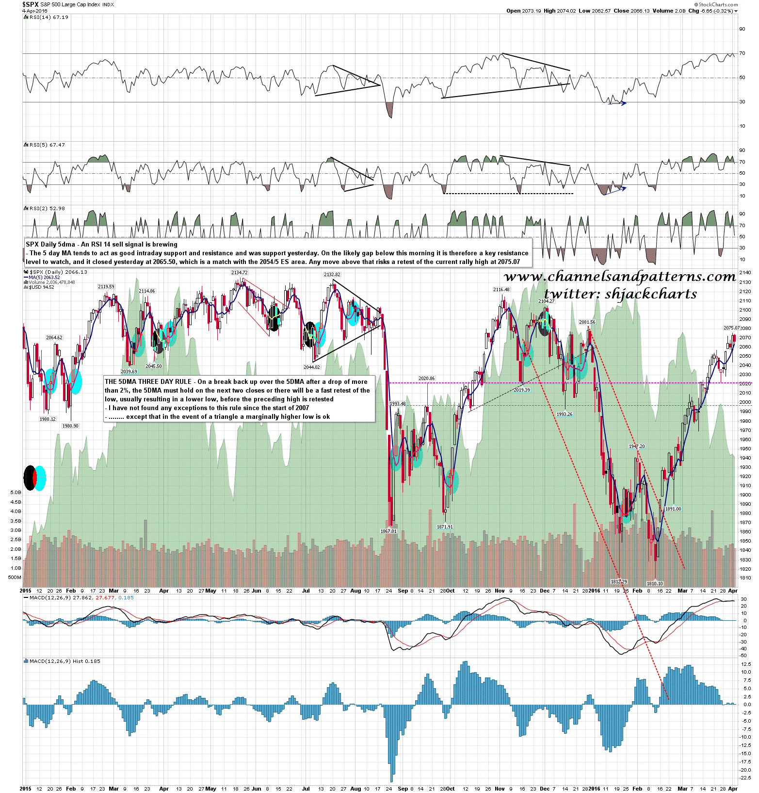 The 5 day MA tends to act as good intraday support and resistance and that closed at 2065.50. Any move above that level risks a retest of the 2075 high. SPX daily chart: