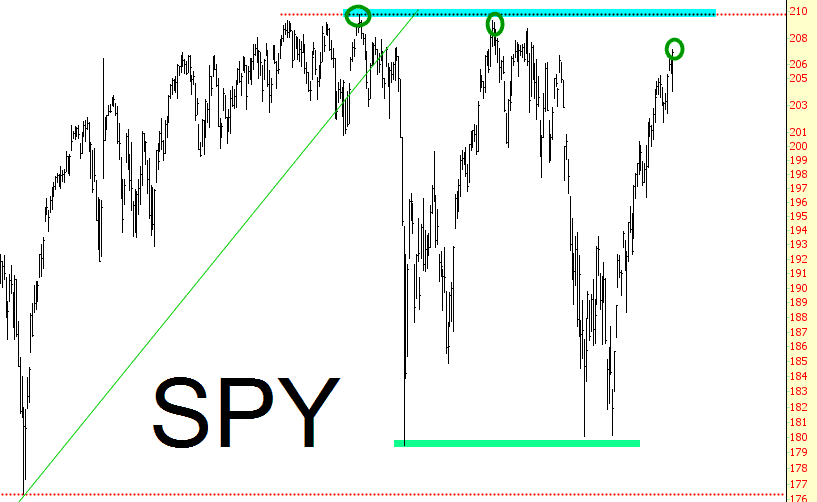 The S&P 500 (“spiders”) has been in a broad range for years now. The bottom of the range tends to be around 180, and the top of the range is around 205-210. Please note something important, though. Even though the market falls fairly consistently to the same level, its rises have been with diminishing peaks (circled below). In any event, I think we can all agree that the price is at the upper end of its range, and frankly, if the powers that be think that these countertrend rallies will provide some kind of calming salve to the public psyche, that calm gets ripped away in a big hurry when the market plunges again for the umpteenth time.
