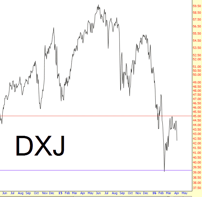 Finally, a favorite of mine, the Japanese ETF symbol DXJ, which is a blend of both equities and the Japanese Yen, has one of the cleanest-looking topping patterns out there, and its weakness on Friday exhibited that nicely.