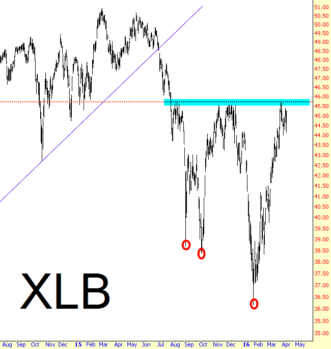 The materials ETF (XLB) has a bit of a similar situation, since it rises to about the same level (45.50 or so) but has recently been falling with increasing gusto (red circles).