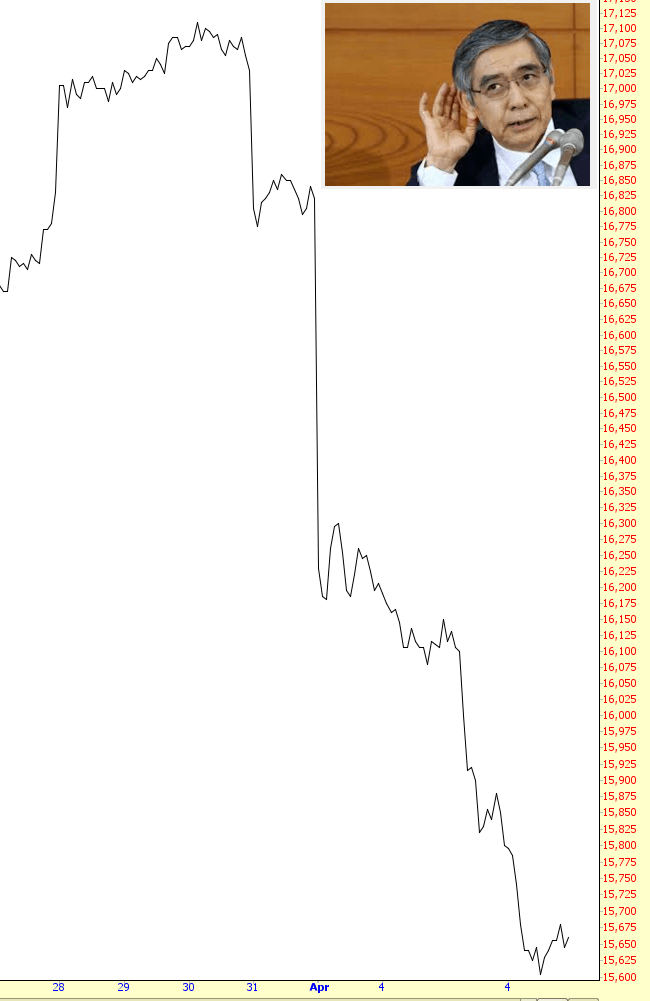Now, since Kuroda is nothing more than Yellen with a smaller dick, his mission is the same as hers (if you’ll permit me the use of the feminine personal possessive pronoun, whose accuracy understandably may be debated): to enrich the rich. That, likewise, is going less-than-swell. Here’s what the Nikkei has been doing lately.