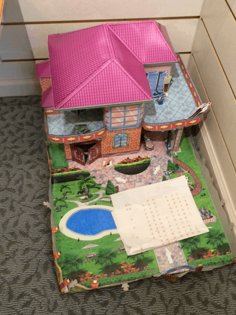 As I was looking around, I noticed a kind of cheesy doll’s house on the floor near all the coffins. I assumed it must be to keep young children entertained while their parents browsed the various corpse crates. It was a pretty lame little dollhouse, flimsy and made of paper, but I figured it was better than nothing.