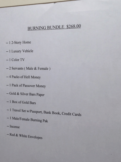 As I glanced up, though, I noticed a “Burning Bundle”, which apparently is a collection of paper stuff intended, I suppose, to throw into a coffin with a person. Since it’s “burning”, I further assume it is meant for those slated for cremation, and these material goods somehow will find their way to accompany the person to The Other Side, so they can enjoy a McMansion, a flat screen television, and other goodies in the hereafter.