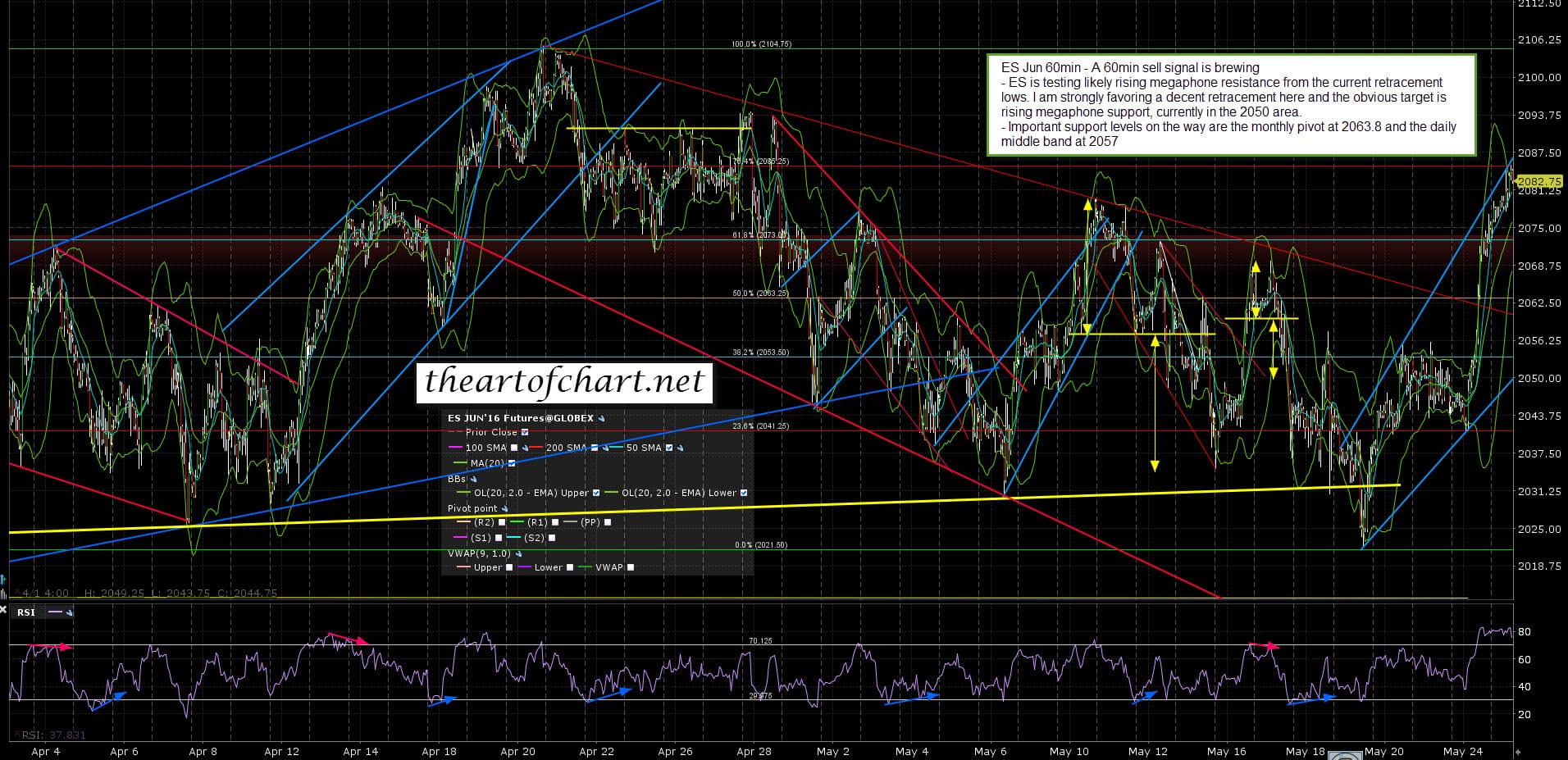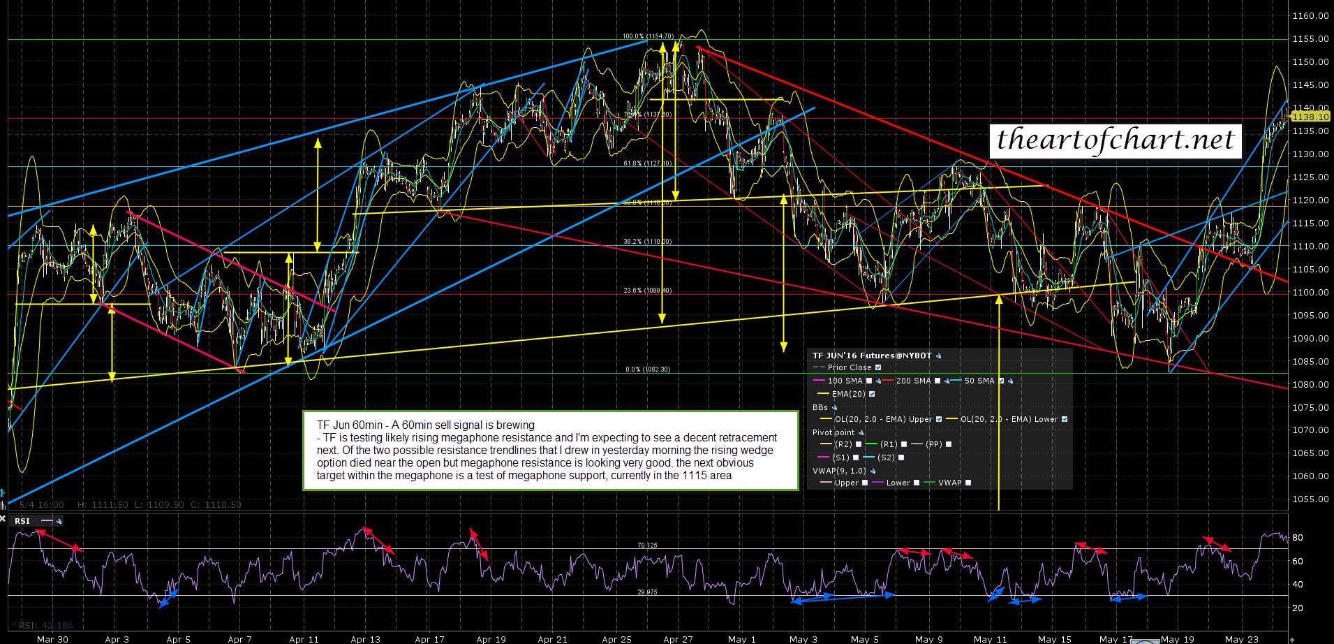 Yesterday’s move was very powerful and all of ES, NQ and TF are in likely rising megaphones, and testing resistance on those megaphones. All three have 60min sell signals brewing and we should see a decent retracement start very soon. ES Jun 60min chart: