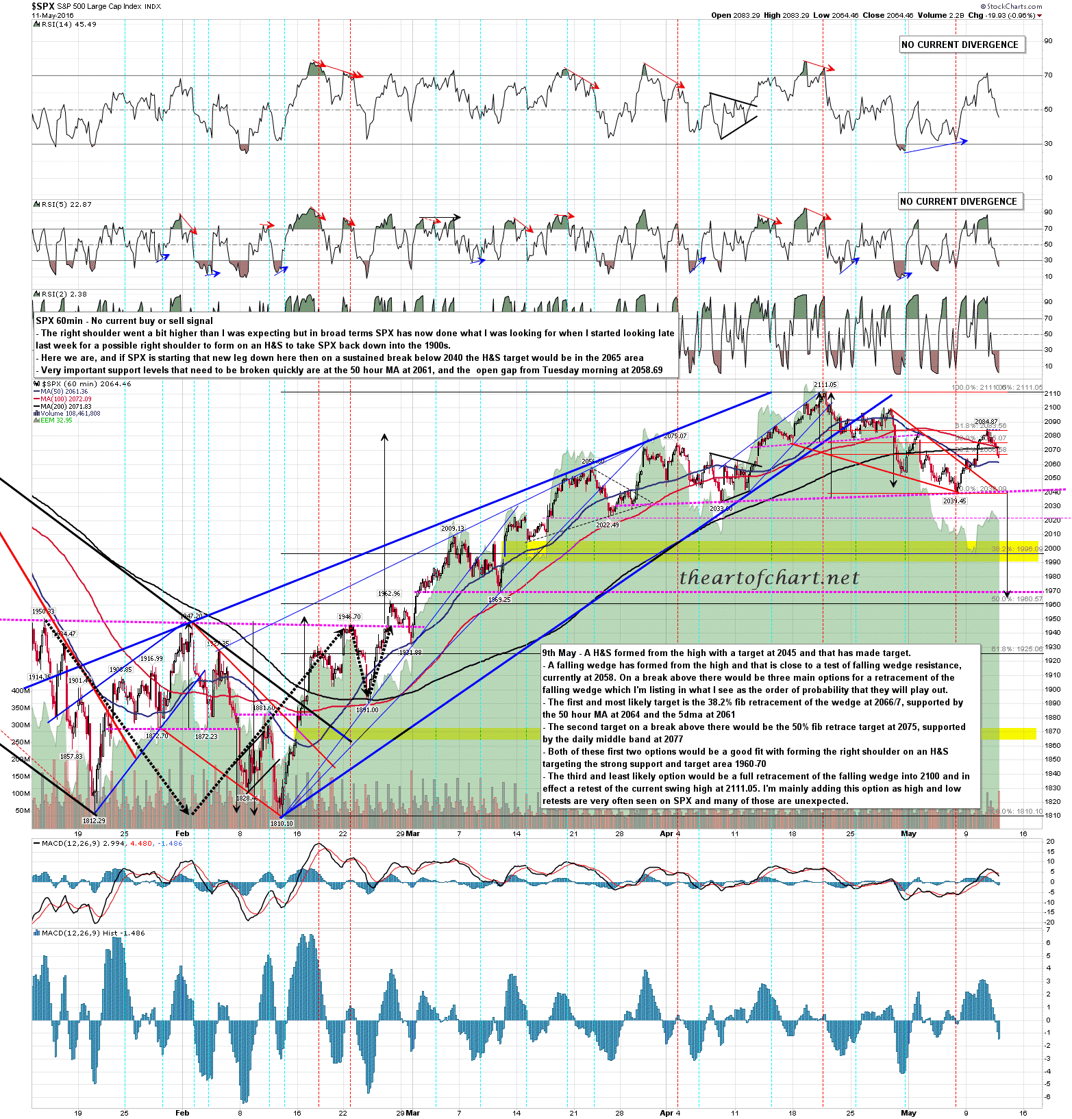 The next steps on this setup are firstly for SPX to fill Tuesday morning’s opening gap at 2058.69 and convert that area to resistance. As it is at the same level as the ES weekly pivot that would mean that both key support areas on ES at the monthly and weekly pivots were converted too. After that a sustained break below the H&S neckline in the 2040 area should deliver the next leg down.