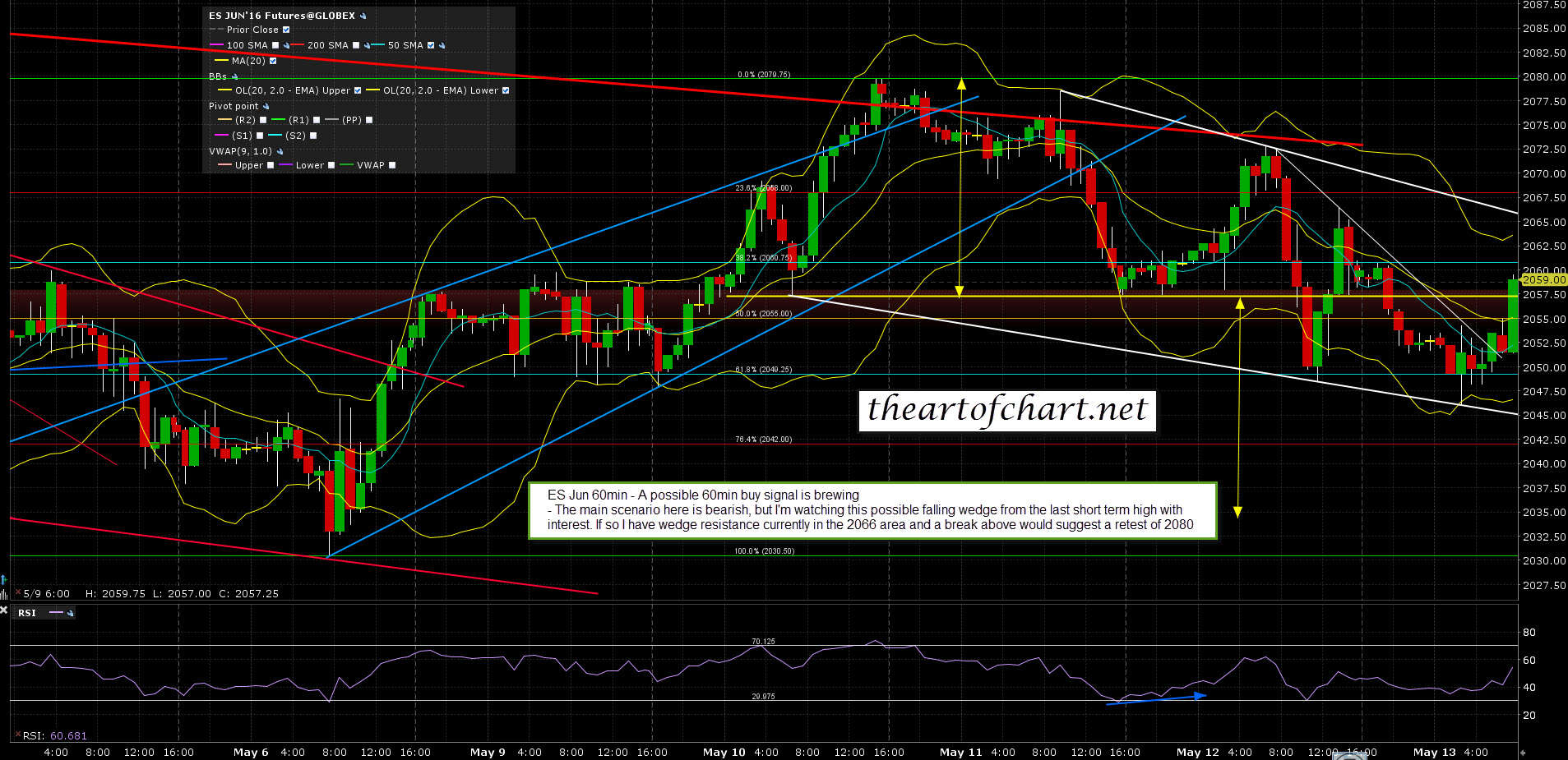 What I would say though is that I have a possible falling wedge forming on ES that I would like to see not hit possible wedge resistance again. That resistance is currently in the 2066 area and if that should be hit, then the confirmed falling wedge might be telling us to expect a retest of 2080 soon. That wouldn’t mean that the bear scenario here would die, but it would promise an extension in the period spent chopping around waiting for something interesting to happen. ES Jun 60min chart: