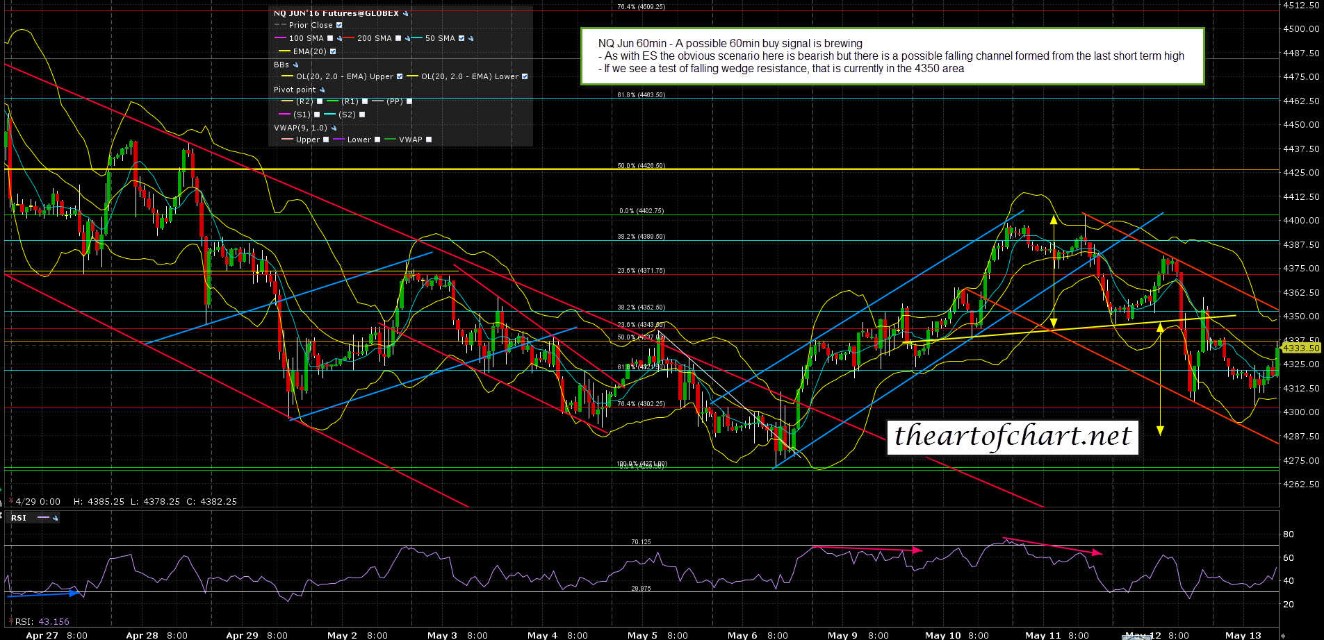 NQ has formed a possible falling channel from the last high, that actually broke up slightly at the opening high, but no target on that break as that isn’t a bull pattern. NQ Jun 60min chart: