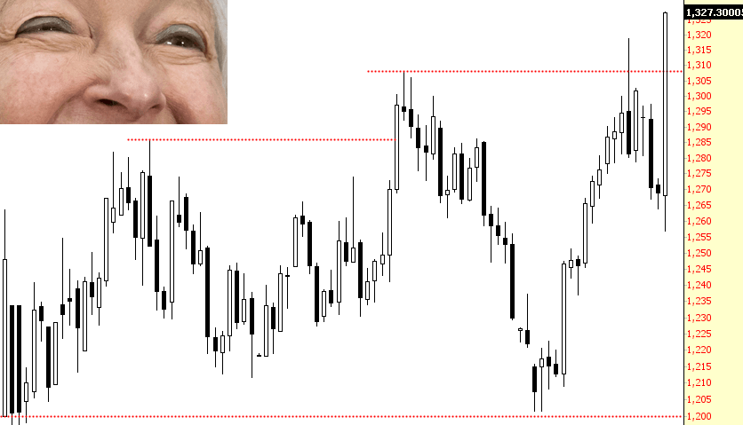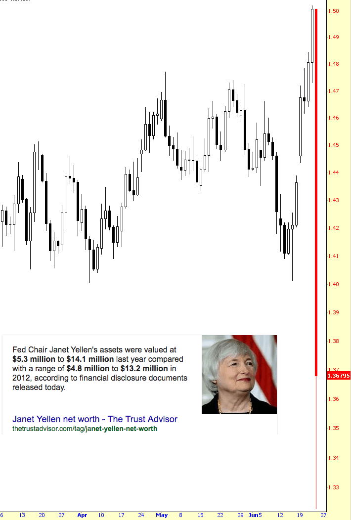 In sharp contrast, gold has been telling the central bankers precisely what to do with themselves……and we have Janet’s dazzling eyes and darling twisted nose to augment our graph:
