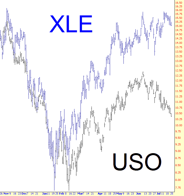 Since a small minority of Slopers don’t enjoy posts dedicated to asian transsexuals, I thought I’d mix things up a bit and point out something interesting: I’m very gung-ho about energy short positions, as you know, and I contend that the overall energy stock sector (represented by XLE, shown below in blue) is going to “catch down” to oil’s crumbling price sooner or later.