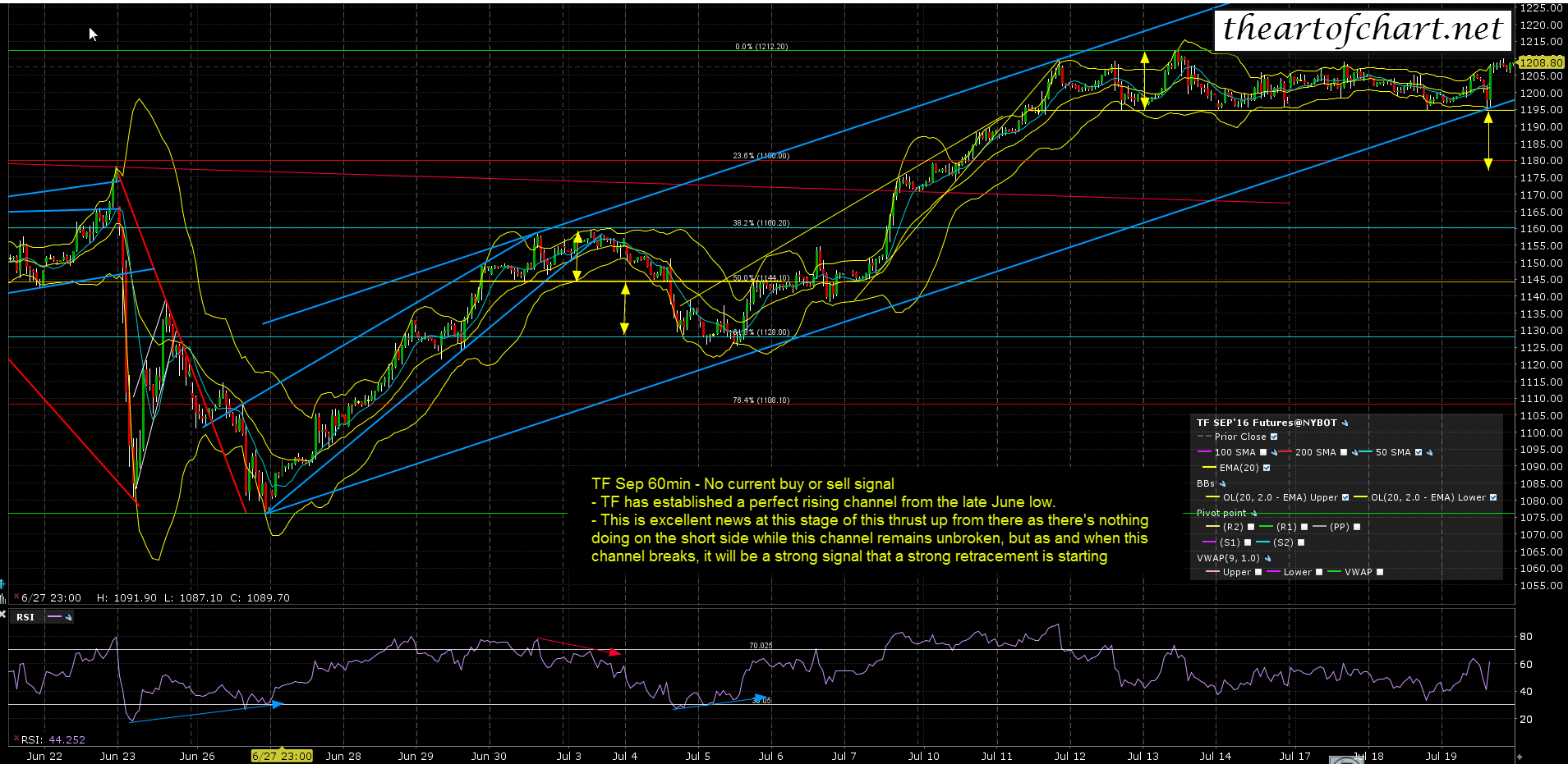 One thing I was very pleased to see last night was that after TF broke rising support from the 1085 low, a rising channel from that low was then established. This gives us a very useful marker for when this uptrend has likely topped out. There’s not a lot happening on the short side while this channel survives. After it fails there shouldn’t be much of interest on the long side until SPX at least retests the daily middle band as support. TF rising channel support is currently in the 1201/2 area. TF Sep 60min chart: