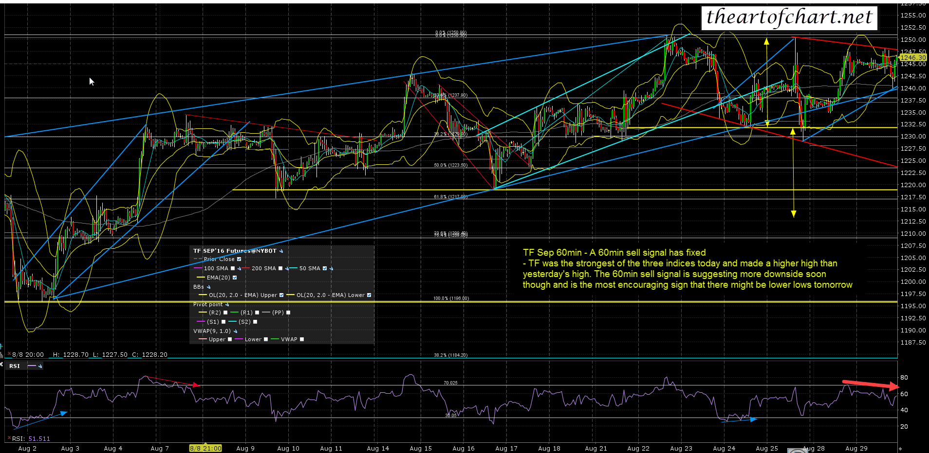 TF also consolidated sideways overnight. Short term rising support in the 1243 area. TF Sep 60min chart: