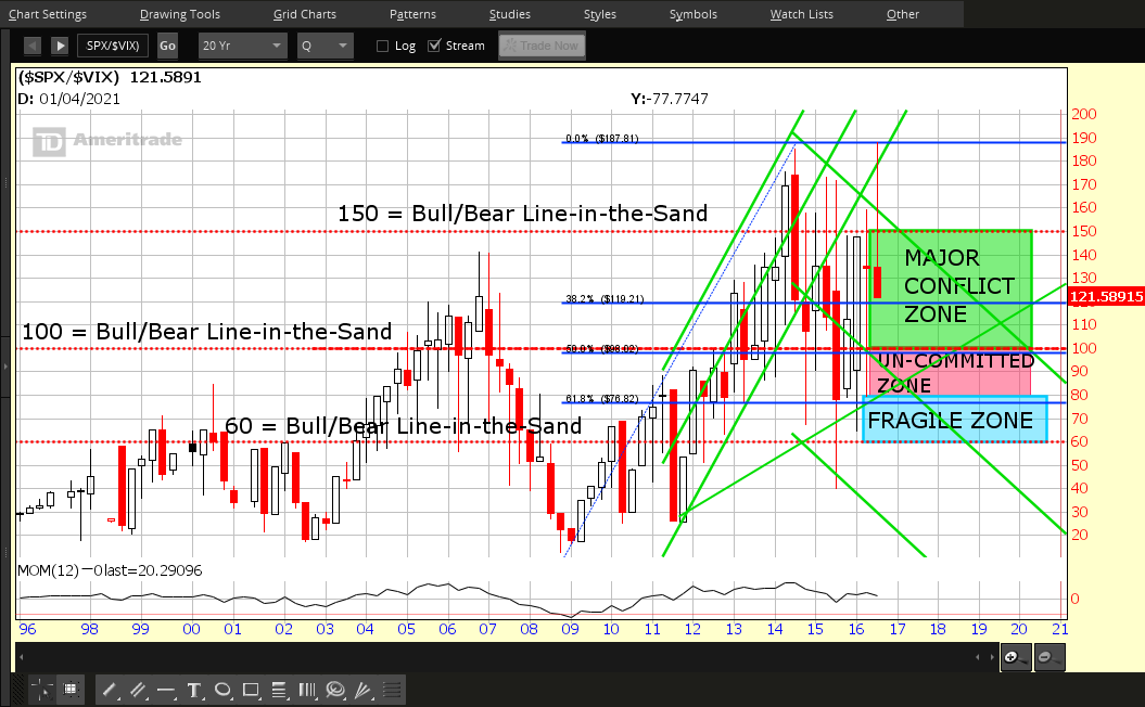 After today’s (Friday’s) 53.5 point drop on the SPX, volatility has now fallen back into the “Major Conflict Zone,” as depicted on the following 20-Year Monthly ratio chart of SPX:VIX.