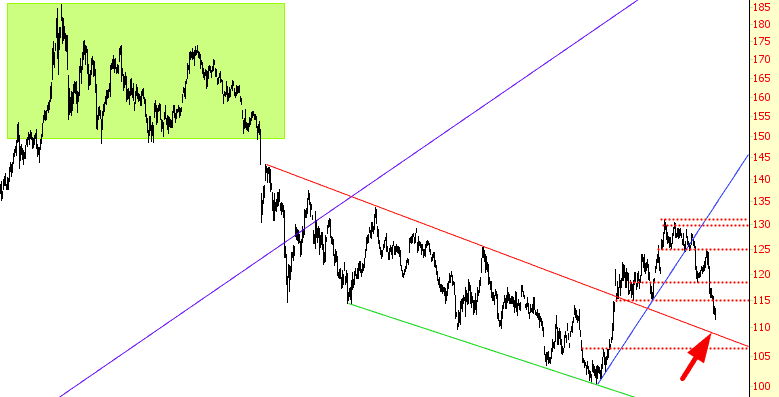Looking at the longer view, I suspect gold will remain weak until it tags the red trendline at approximately the place I’ve put the arrow. At that point, it has a chance to rally, but no higher than the aforementioned gap. If and when all of that happens, I further suspect gold will simply re-weaken and perhaps even crack back down into the triple digits again (although I doubt it will get that bad).