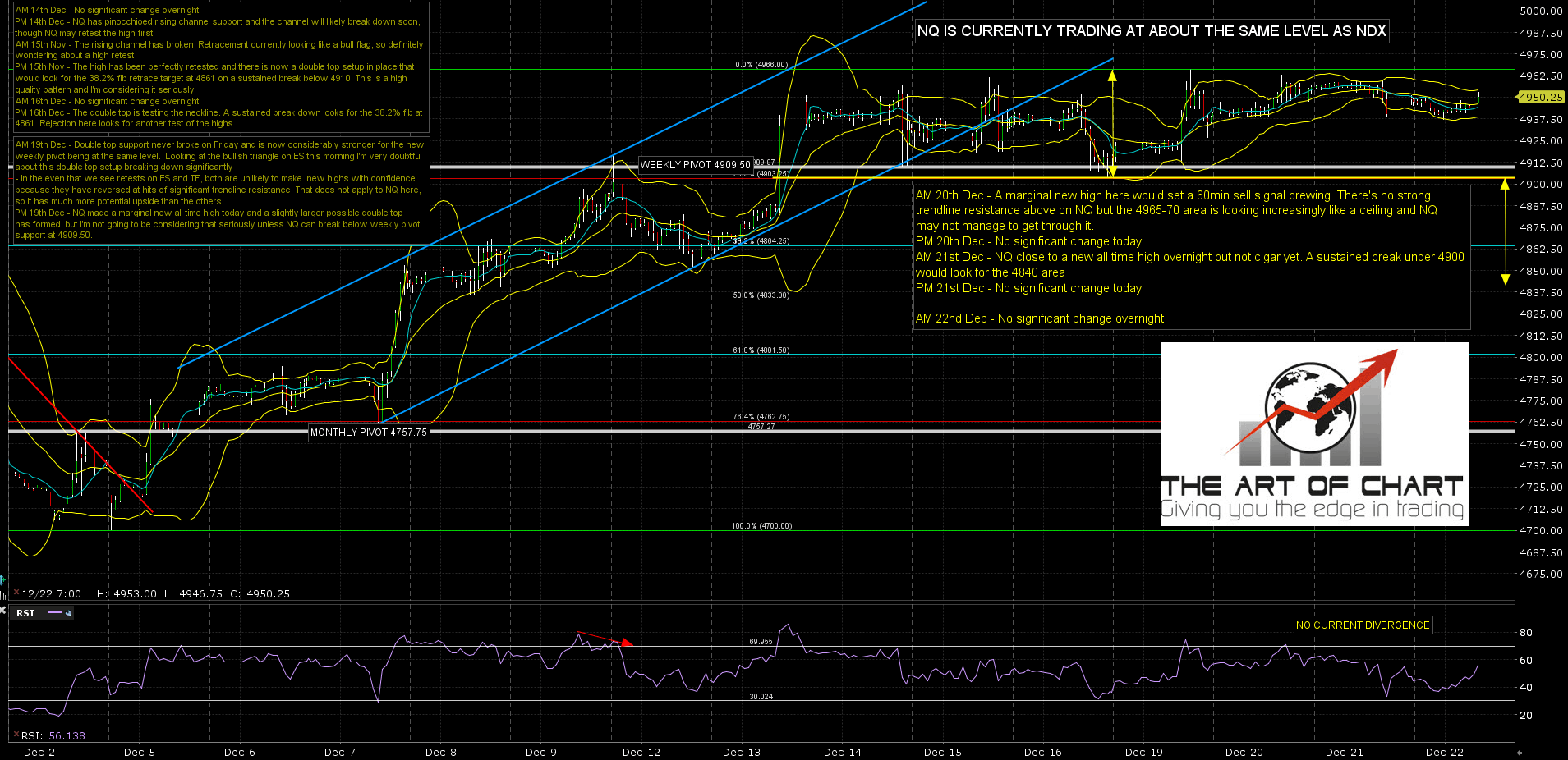 The tape is low volume and has been pretty dull this week on indexes, particularly on NDX/NQ. Volume is unlikely to increase much before next week and the tape may well remain boring, though at the time of writing ES and TF are making a spirited attempt at converted the weekly pivots there to resistance, and if that attempt is successful then this might get more interesting, though it might just establish a tape just as boring with a different underlying bias.