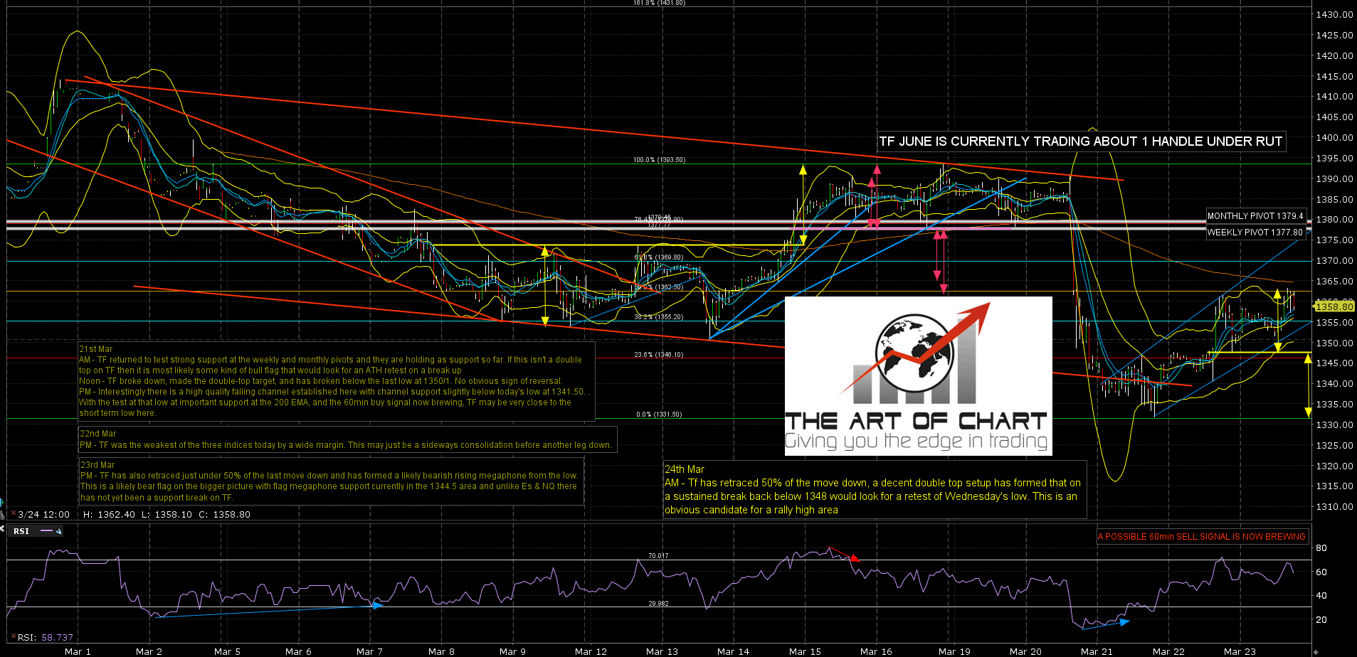 TF made a marginal higher high today as well, reaching the 50% fib retrace target and a possible 60min sell signal is now brewing. Again this is a candidate rally high area. TF Jun 60min chart: