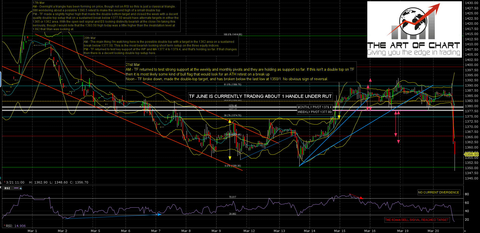 I’m watching for divergence here and looking for possible high retests starting soon on SPX/ES & NDX/NQ. Less likely on RUT/TF. We may not see those retests but if seen those should set up some great entries for the main decline to come. Today is a cycle trend day and it may be that there will be no significant rally until the last hour or the close.