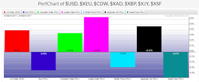 The following five percentages gained/lost graphs show, at a glance, which countries and currencies gained the most, so far, this week (Monday, March 27 to, and including, Wednesday, March 29).