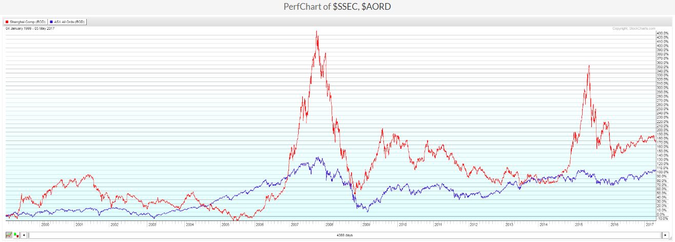 For many years, the charts have shown that, as China’s Shanghai Index (SSEC) goes, so goes Australia’s Composite Index (AORD), as shown on the multi-year comparison graph below.