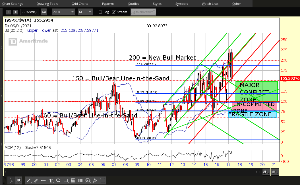 In this regard, watch for a break and hold below the 150 major support level on the SPX:VIX ratio, as well as a drop and hold below zero on the Momentum indicator, as shown on the Monthly ratio chart below.