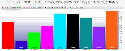 So far, the equity markets have ignored the rants from the media and political opponents. The SPX is hovering at all-time highs, as shown on the following Monthly chart, and has gained 12.2% since the election, as shown on the percentages-gained graph below of the Major Indices.