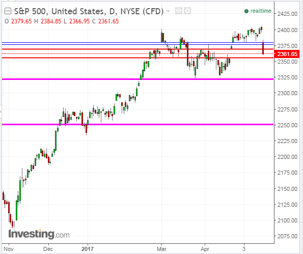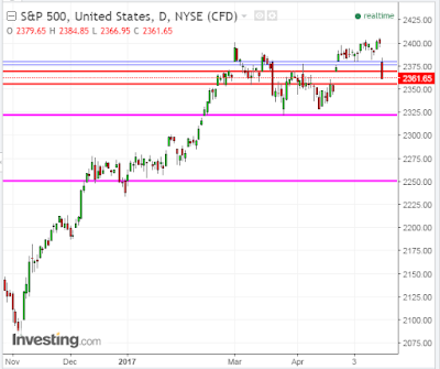 A drop and hold below 2320 could see a swift plunge to 2250, or lower and may be influenced by a major change in market perception of Washington’s ability (or inability) to function and produce any meaningful progress on the kinds of economic stimulus programs, tax cuts and reforms, etc., as promised by politicians during last year’s election and, on which, market players were counting, as they invested heavily from that time…particularly, as the Fed reduces its monetary stimulus measures and continues raising interest rates.