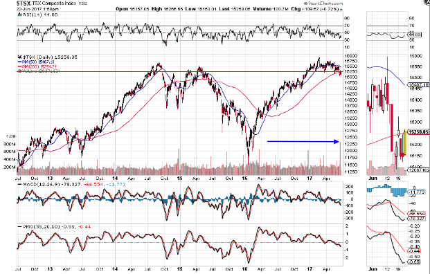 After reaching all-time highs earlier this year, Canada’s TSX Index has dropped to around the 15,250 level, as shown on the following Monthly chart…an important long-term major support/resistance level.