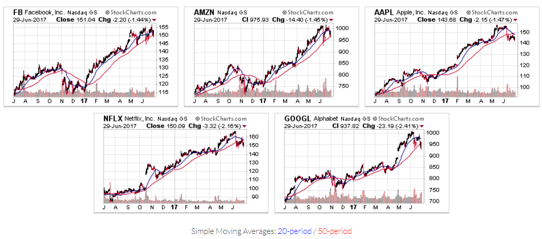 The last chart grid shows that all five FAANG stocks are immersed in their respective consolidation zones, but have fallen to either their 50-day moving average or price support levels. If these break and hold below support, this could, indeed, confirm overall weakness in equities and begin a summer selloff in earnest.