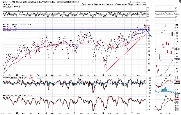The following three ratio charts compare the strength of the NDXRUT, and SPX with their respective Volatility Index.