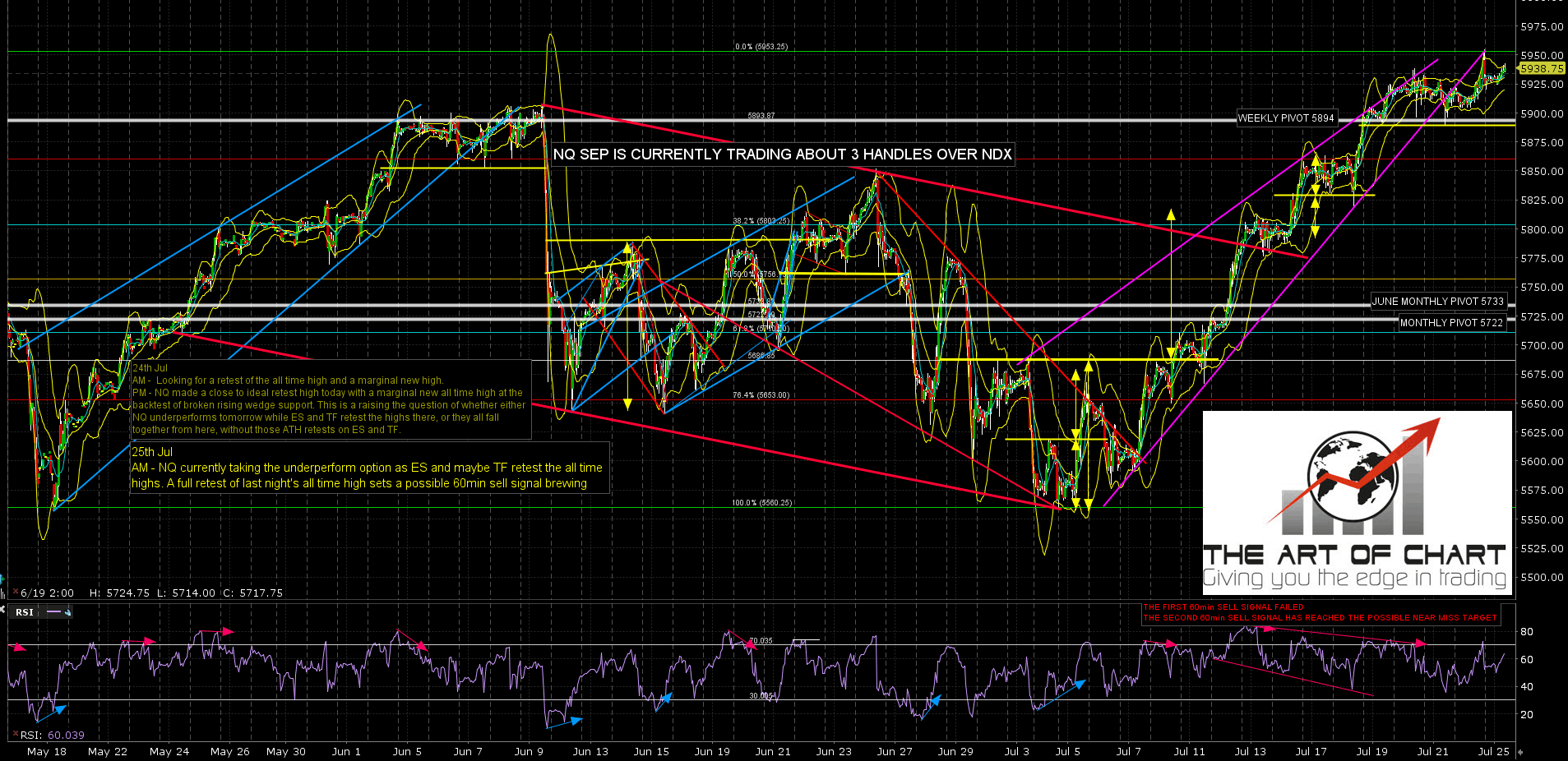 NQ may already be breaking down. Under 5900 the swing high is likely made. Until then I’m wondering about a possible retest of last night’s high to set a possible 60min sell signal brewing. NQ Sep 60min chart: