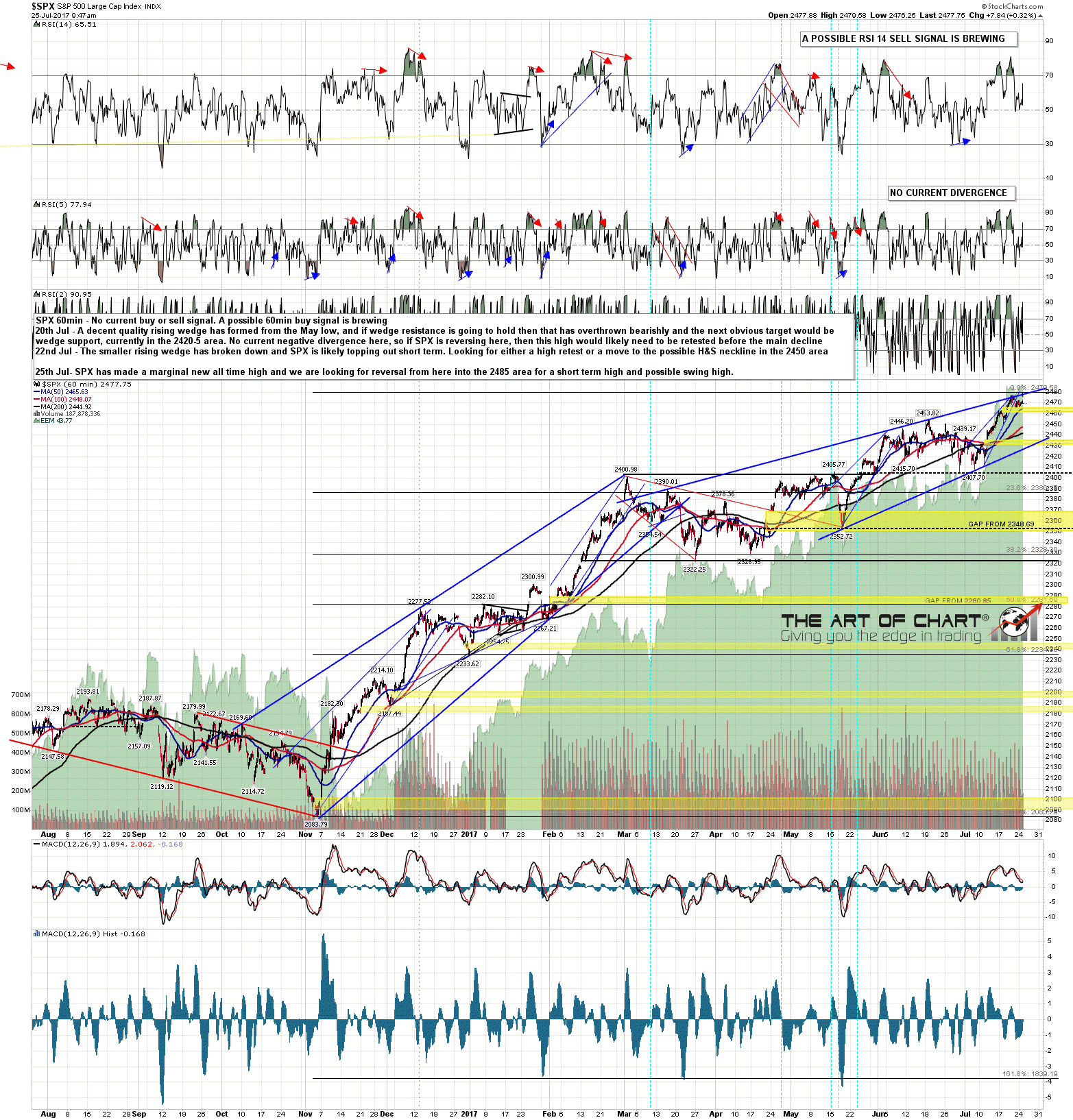 The rising wedges that I was looking at on Thursday broke down and have been retesting the all time highs last night on NDX, and this morning on SPX, with another possibly coming on RUT though Stan’s thinking lower high there. We are looking for a failure today on SPX anywhere from a marginal new high up into the 2482 area, and so it’s possible that this short term high is already made. On the bigger picture this is a possible swing high, but we’ll have to see whether any serious breakdown can be sustained from here. This has been a very persistent uptrend. I posted the premarket video that I do every morning for Daily Video Subscribers at theartofchart.net on my twitter before the open and if you missed it then you can see that here. As well as equity indices that also covers DX, CL, NG, GC, ZB, HG, KC, SB, CC & ZW of course.