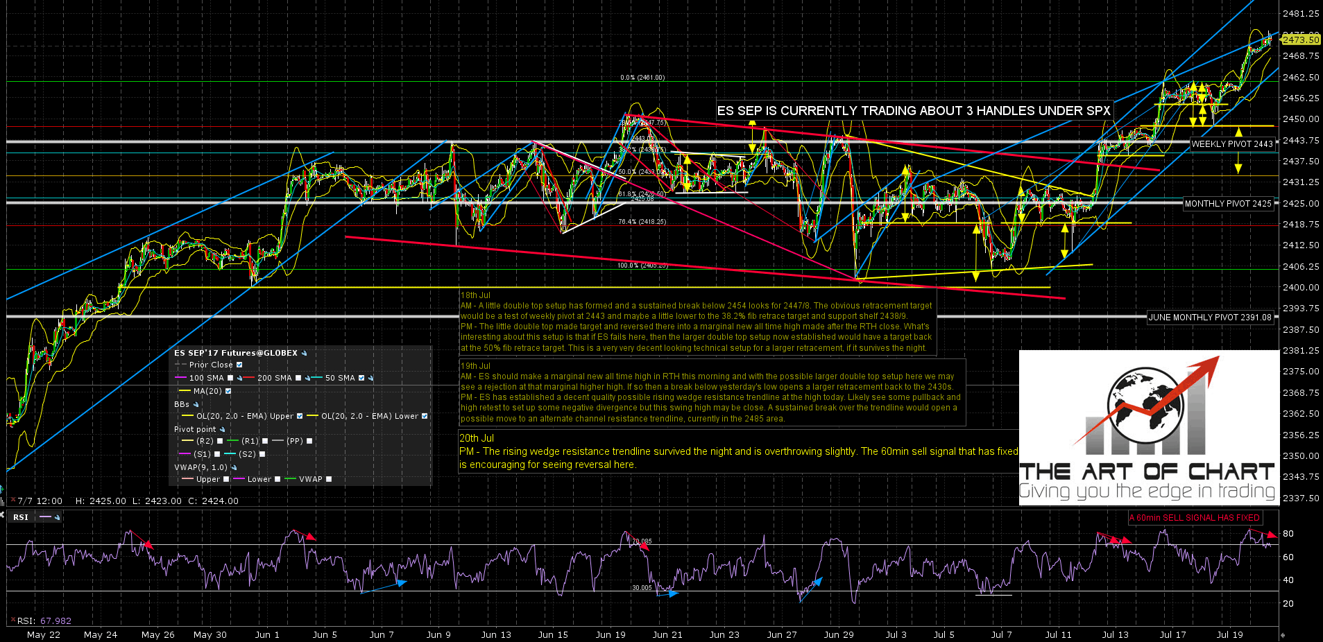 ES has slightly overthrown wedge resistance on a decent rising wedge from the last low. In the event of a sustained break over wedge resistance I do have an alternate channel option with channel resistance currently in the 2490 area. ES Sep 60min chart: