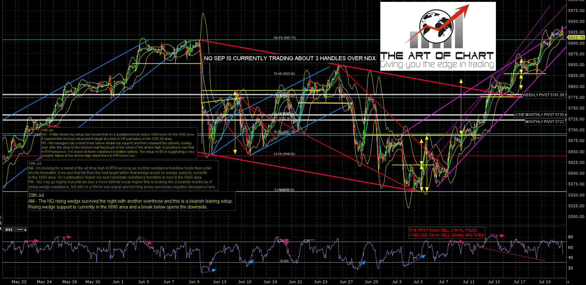 On NQ there is a similar rising wedge, with the wedge resistance trendline somewhat weakened by two overthrows rather than just one. Again there is a decent alternate trendline above but if there hadn’t already been a 60min sell signal fixed, another would have fixed this morning. NQ Sep 60min chart: