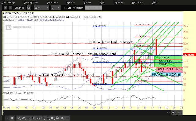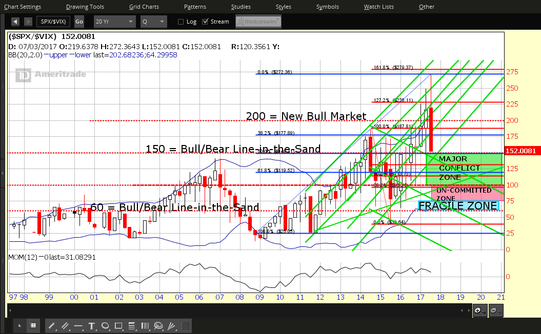 Each candle on the following ratio chart of SPX:VIX represents a period of One Quarter.