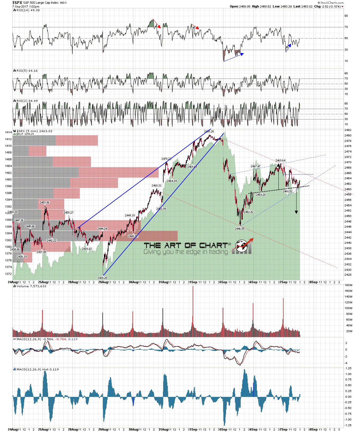 In the short term there is a possible H&S formed or forming that could take SPX through short term support into another test of the daily middle band, currently at 2451. That’s the alternate scenario if SPX tests short term support until it breaks. A break over yesterday’s intraday high at 2469 would kill the setup. SPX 5min chart:
