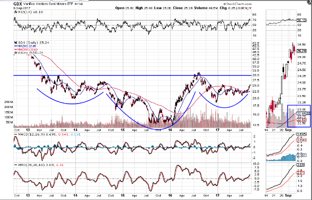 Price on GDX has been advancing along with that of GOLD, as it also approaches its neckline of a reverse Head & Shoulders formation at 1376, as I described in my post of August 28. On Friday, GOLD made a high of 1362.40 and closed at 1351.20.