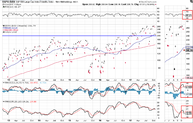 I last wrote about the SPX:VIX ratio in my post of October 17. At the time, volatility was creeping higher, as the SPX was making new highs.