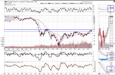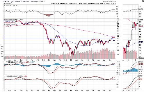 Price briefly hit the 60.00 level today (Tuesday) and is trading above two levels of major support — 54.66 (23.6% Fib retracement level) and 48.00 (price and channel centreline support).