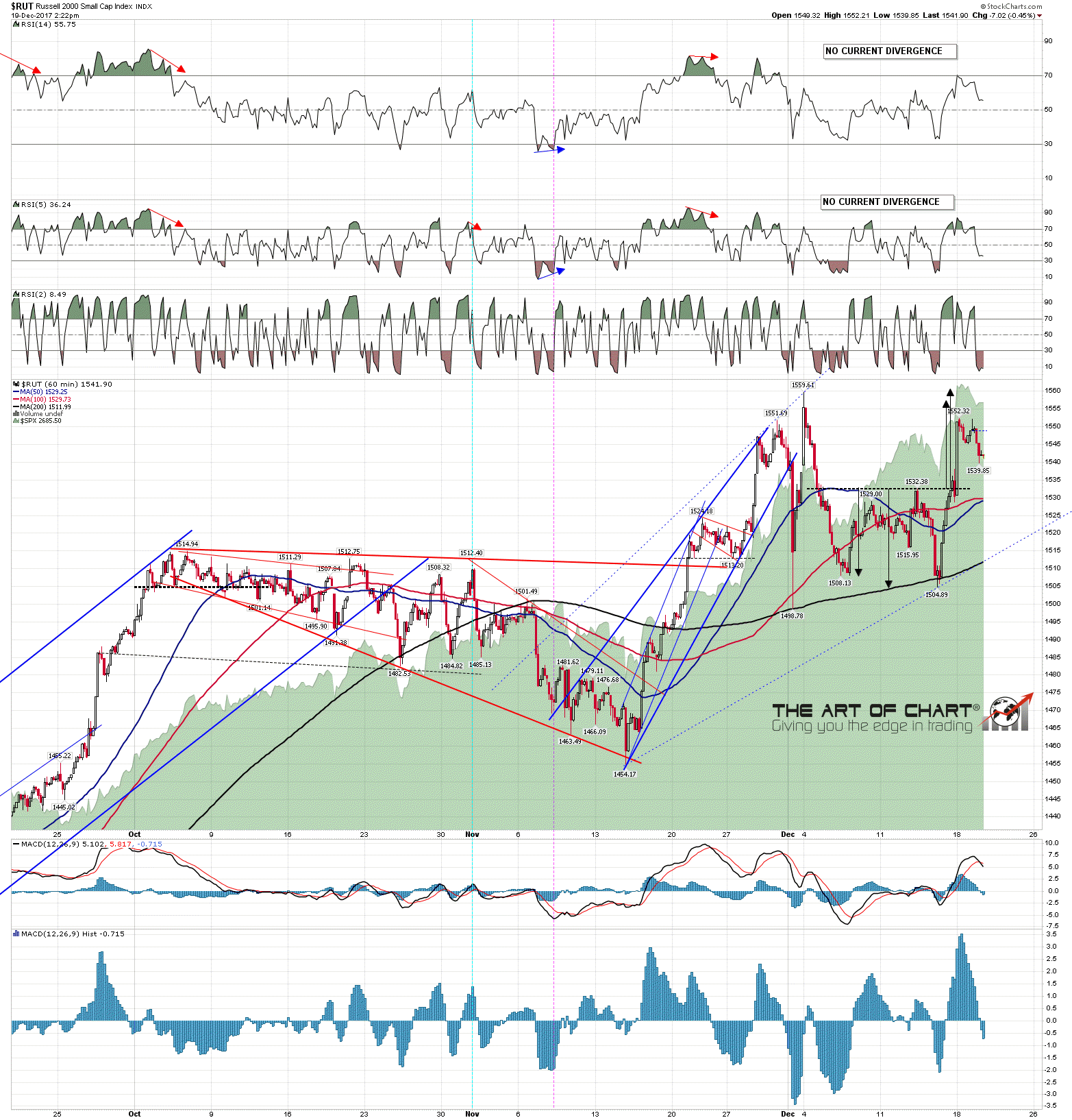I was seeing a possibility of a retracement  last night and was talking about that this morning in my premarket vid. The 60min sell signals on ES and NQ have made target but there is a strong case on NQ for a hit of a wedge support trendline currently in the 6460 area and that has not yet been hit. On TF this is likely to be a pullback to establish a rising support trendline before the high probability retest of the all time high, though obviously this is a big news bomb week. Intraday Video – Update on ES, NQ and TF: