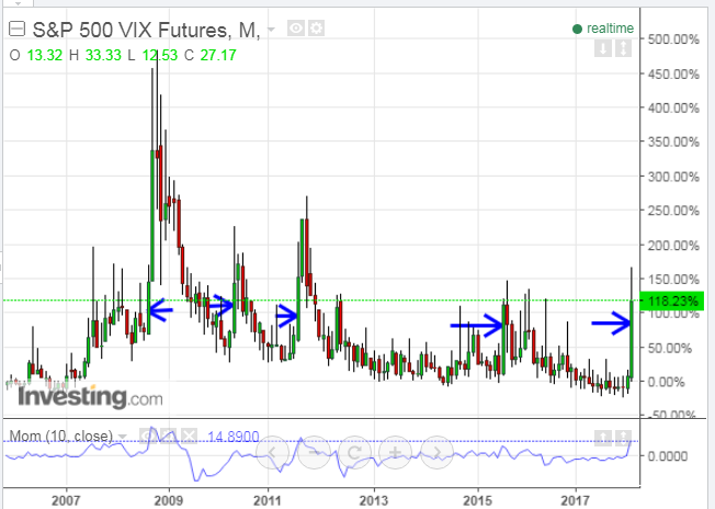 Finally, of interest is the trading range of February’s candle on the following monthly (percentage) chart of the VIX.