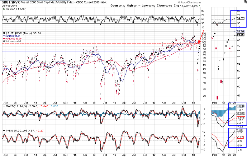 The Death Cross level is represented by the red horizontal line. The RUT:RVX ratio and the NDX:VXN ratio have come the closest to retesting this line, while the SPX:VIX ratio is still well below.