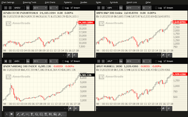Each candle on the following charts of the Dow 30, S&P 500, Nasdaq 100 and Russell 2000 Indices represents a period of one quarter of one year.