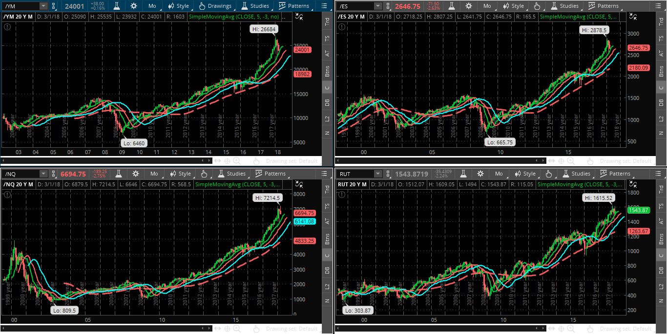 Finally, the following monthly charts of the Dow 30, S&P 500 & Nasdaq 100 E-mini Futures Indices plus the Russell 2000 Index show that price is hovering above a moving average “Alligator” formation. If price falls inside this formation, we’ll see high volatility and wild swings remain, with, possibly a further correction in equities, until it breaks out and holds above this beast. Unless we see a very sharp snap-back soon in these indices (in the next week or two), I’d say that higher volatility will continue for awhile.