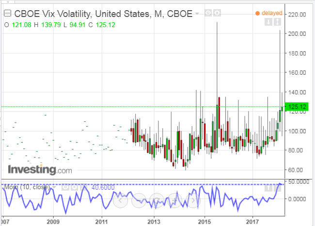 The following monthly chart of the CBOE VIX Volatility Index (VVIX) shows that momentum of VIX volatility closed on an all-time high last month, forecasting rising volatility of equity volatility and risk. Where it closes next Friday may provide a hint as to acceleration or deceleration of further equity decline in the month(s) ahead.