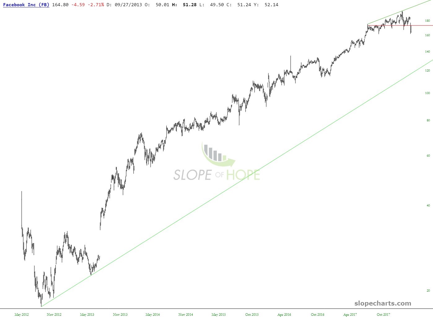 Completely Zucked By Tim Knight - 7 years ago (22, Mar 2018 8:52:04 AM) Here’s the medium-term pattern on Facebook, which is one of my shorts. And here’s the big picture, showing that the stock is miles away from long-term support. « Prior Next » https://slopeofhope.com/2018/03/completely-zucked.html Completely Zucked In order to comment on this blog, you must have JavaScript installed and enabled. « Prior Next »
