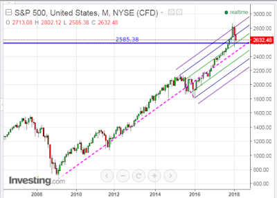 Look out below if price drops and holds below that level! And, a retest of the pitchfork median (broken pink line), currently around 2460, is long overdue.