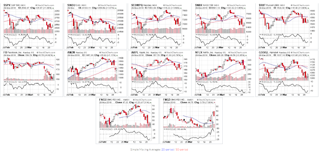 The following 1-year daily and 2-month charts of the SPX, INDU, COMPQ, NDX, RUT, 5 FAANGs, FNGU & FNGD show their price relative to their 50-day MA (red), as well as the Rate-of-change technical indicator.
